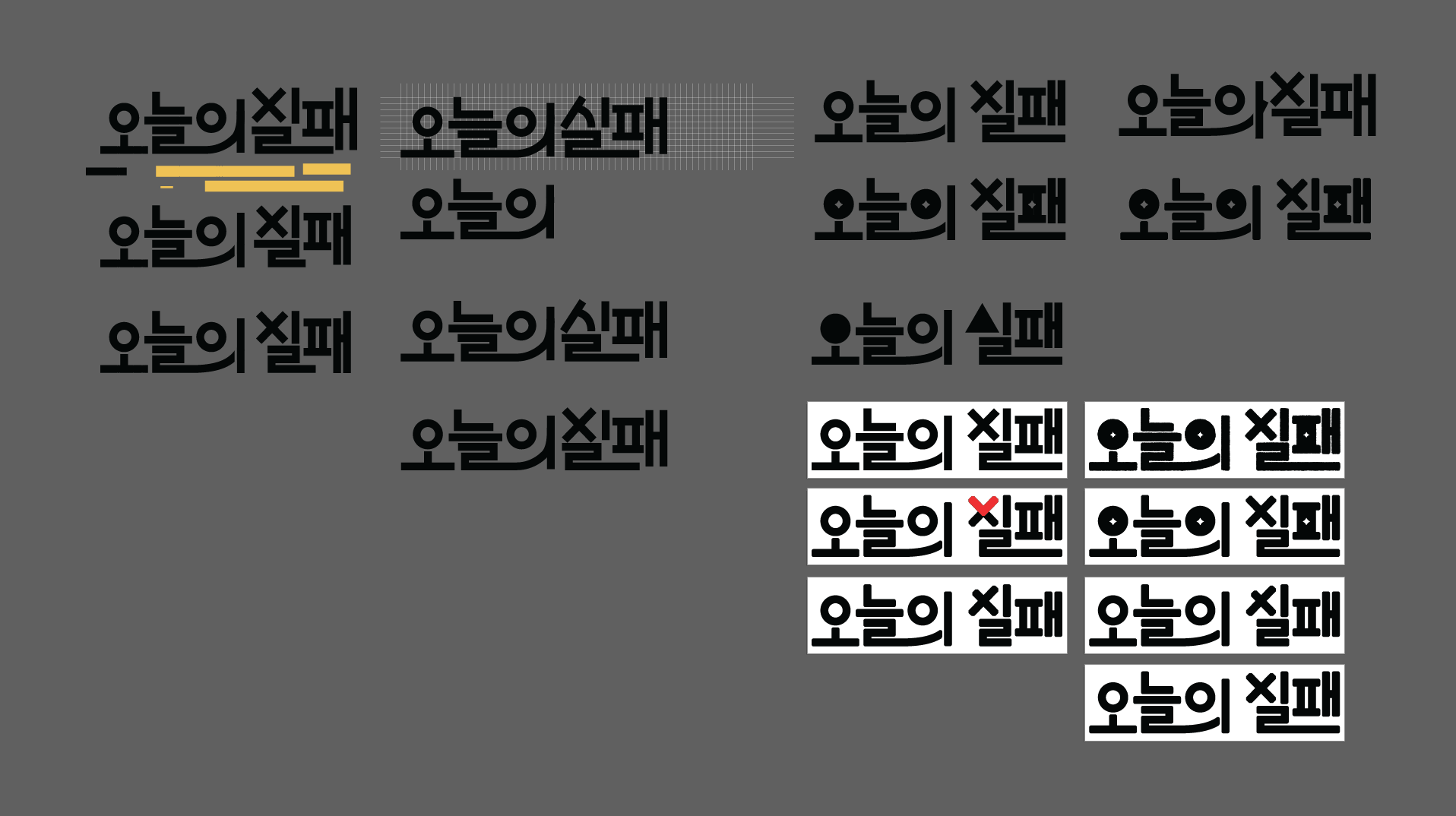 처음엔 글자가 이어지는 형태로 계속 시도하는 모습을 담아내고 싶었다. 이런저런 생각을 담아 작업을 하다보니 성공과 실패를 체크하는 OX가 '오' 와 '실'의 형태와 부합해 이 방향으로 더 발전시켜보았다. 성공과 실패가 공존하는 시도가 <오늘의 실패> 안에 담겨있도록 구성하고자 했다.