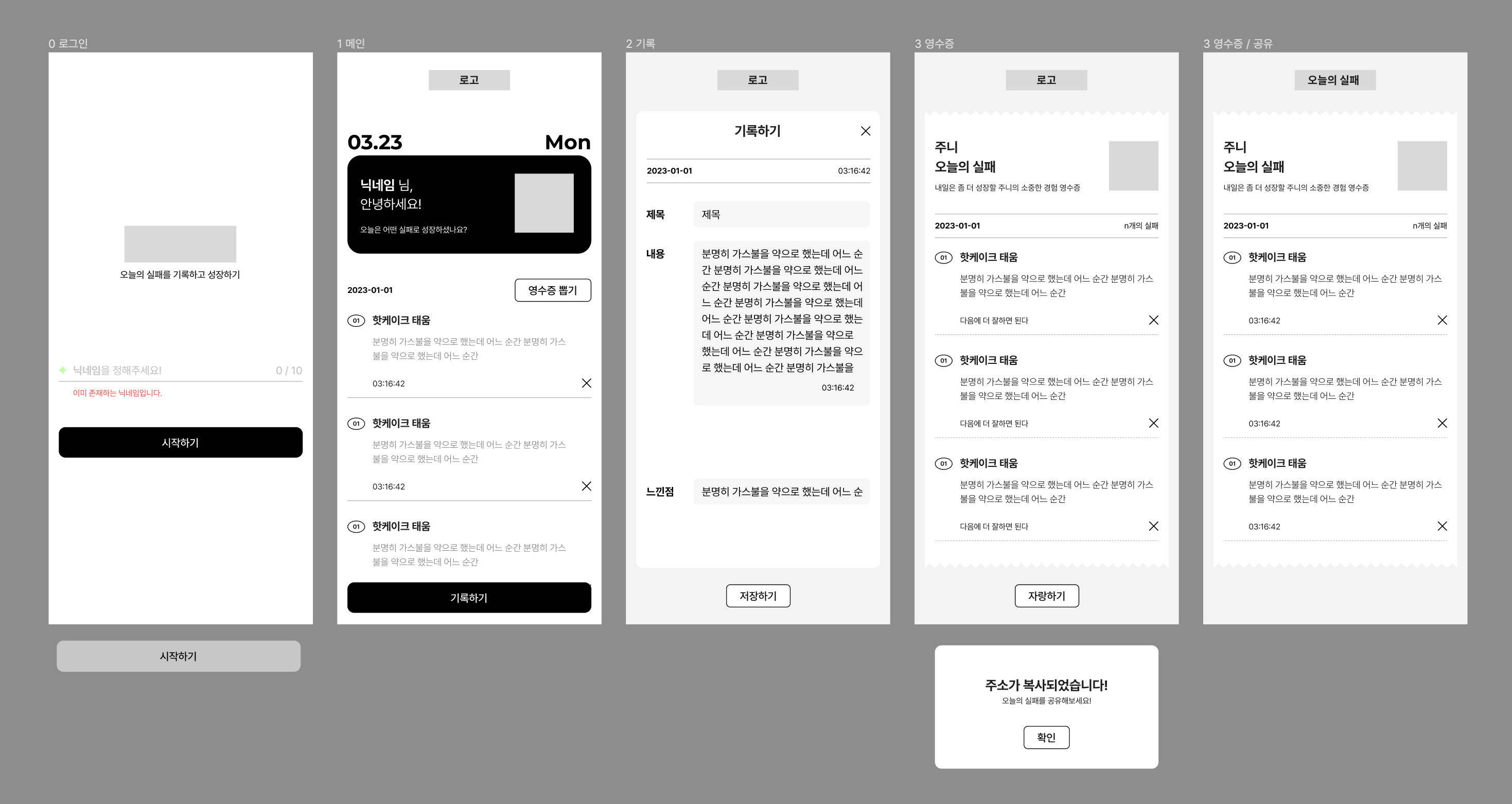 1. 로그인 / 2. 메인 페이지 / 3. 기록하기 / 4. 영수증 뽑기 / 5. 영수증 공유하기