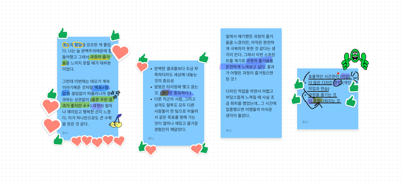 서로의 영역을 이해하고 존중하면서 동시에 편안하게 의견을 공유한 이번 스프린트는 협업을 통해 어디까지 이뤄낼 수 있는지를 알게 된 경험이었다. 결과물이 어떻든 간에 좋은 팀원을 만나 이런 즐거운 경험을 할 수 있다는 것에 감사한 마음이 마구마구 들었다.